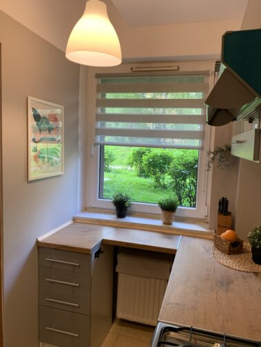 Mieszkanie, zwłaszcza kuchnia były mocno zniszczone przez poprzednich najemców, wymagały wymiany mebli i przearanżowania.