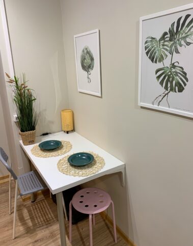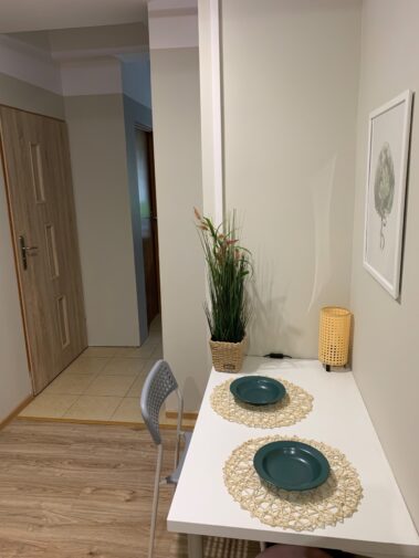 Kuchnia w mieszkaniu nabrała zupełnie innego charakteru, dzięki wymianie mebli i niektórych sprzętów stała się bardziej funkcjonalna, a zmiana kolorystyki wizualnie ją powiększyła. Dzięki temu, że udało się zmieścić w niej lodówkę, kącik obiadowy stał się bardziej przestronny, a przedpokój zyskał przytulny wygląd. Pokoje wynajęły się bardzo szybko, za cenę satysfakcjonującą dla właścicieli.